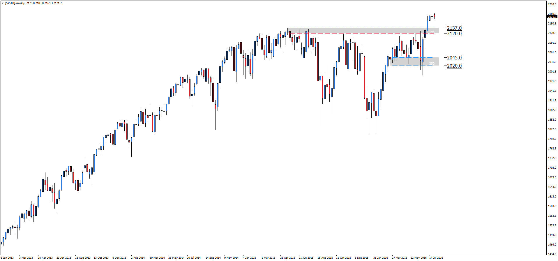 Indeks S&P 500 pokonał tygodniowy opór 2120-2137. Do 29 lipca ponad 25% firm wchodzących w skład indeksu S&P 500 opublikowało swoje wyniki finansowe, które na pierwszy rzut oka wydają się bardzo ciekawe, ponieważ ponad 60% z nich zanotowało lepsze zyski od zakładach. Jednakże w szerszej perspektywie wyniki są tragiczne, bynajmniej zyski spółek spadają już piąty kwartał z rzędu.