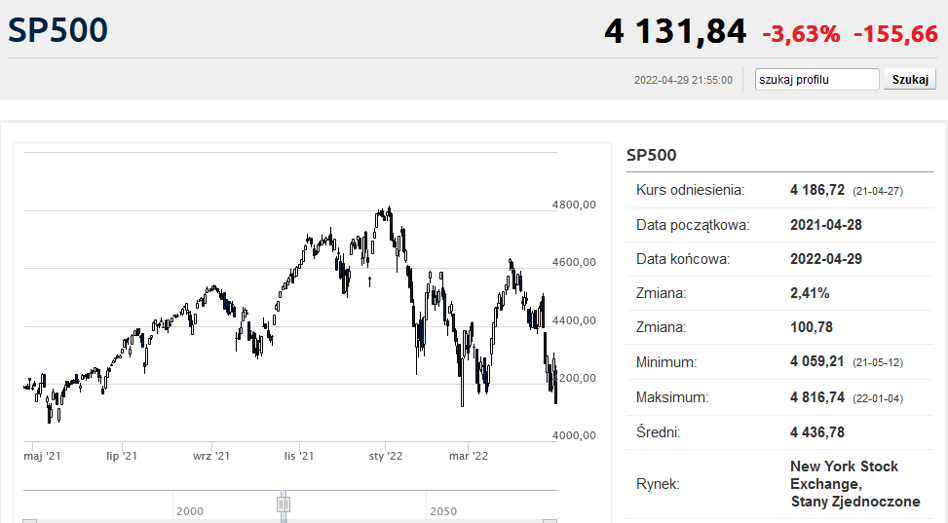 Niemal równie słaby był dziś S&P500, który zaliczył spadek o 3,63%, kończąc dzień na poziomie 4 131,78 punktów. Tylko w kwietniu S&P500 stracił 8,8%, od początku roku oddając ponad 13%. Jak policzyli amerykańscy statystycy, jest to najniższa od 1939 roku stopa zwrotu w okresie styczeń-kwiecień w wykonaniu tego indeksu.