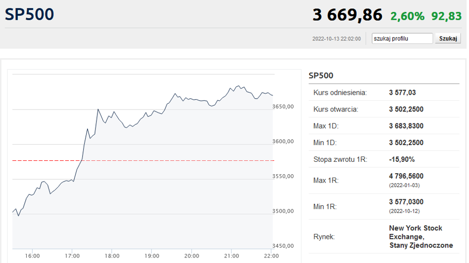 Potem jednak stało się coś, co trudno wyjaśnić. Silne spadki szybko zmieniły się w jeszcze mocniejsze wzrosty. Finalnie S&P500 zakończył dzień na poziomie 3 669,86 punktów, czyli 2,6% powyżej środowego kursu zamknięcia oraz aż o 5,1% powyżej sesyjnego minimum! Zwrot ten nie był poparty jakąś konkretną informacją zmieniającą postrzeganie perspektyw rynku akcji. Można go co najwyżej tłumaczyć silnym wyprzedaniem rynku po serii sześciu spadkowych sesji z rzędu.