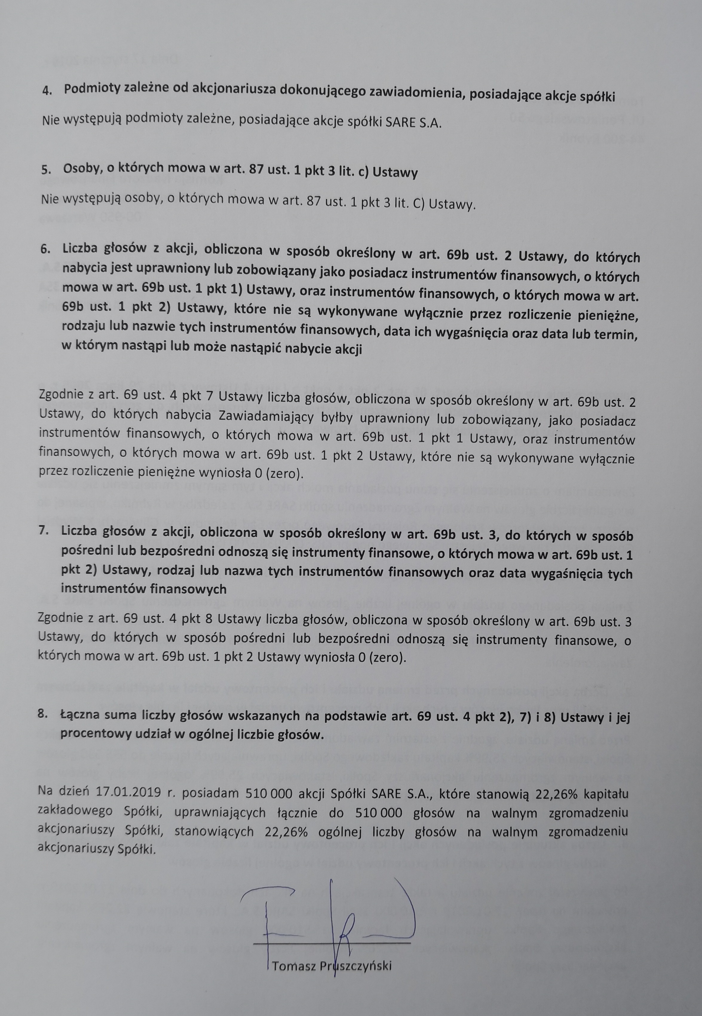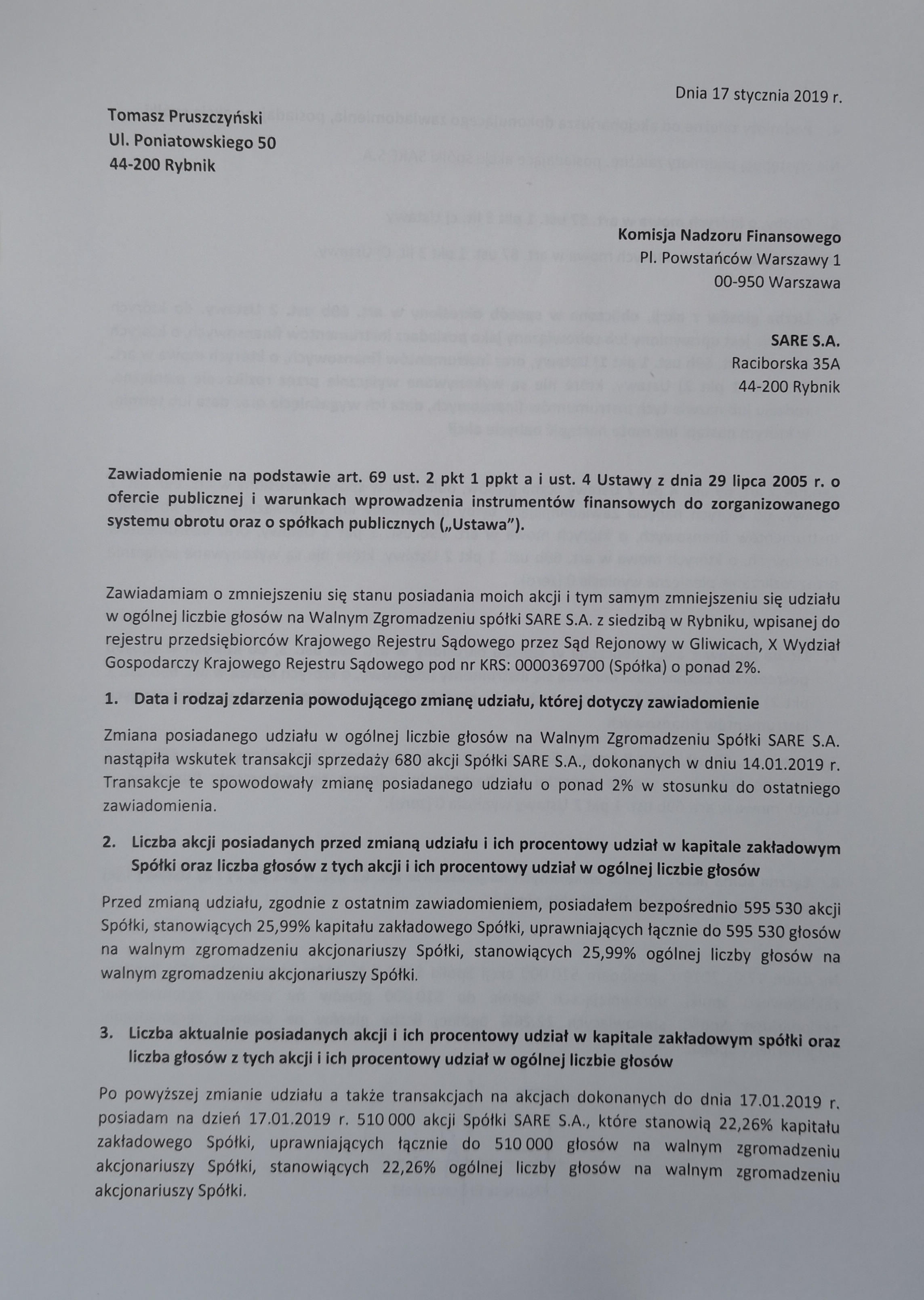 | Zarząd Spółki SARE S.A. z siedzibą w Rybniku („Emitent”, „Spółka”) informuje, że w dniu dzisiejszym, tj. 17.01.2019 r. otrzymał od akcjonariusza Tomasza Pruszczyńskiego („Akcjonariusz”), zawiadomienie sporządzone w trybie art. 69 ust. 2, o zmniejszeniu posiadanego przez Akcjonariusza udziału w kapitale zakładowym Spółki oraz w ogólnej liczbie głosów na walnym zgromadzeniu SARE S.A., o ponad 2%. Zmniejszenie dotychczas posiadanego udziału w kapitale zakładowym oraz dotychczas posiadanego udziału głosów na walnym zgromadzeniu Spółki, nastąpiło w wyniku zbycia przez Akcjonariusza 680 akcji Emitenta. Zmiana posiadanego udziału nastąpiła w dniu 14.01.2019 r. Aktualnie Tomasz Pruszczyński posiada 510 000 akcji SARE S.A., stanowiących 22,26 % głosów na walnym zgromadzeniu Spółki oraz 22,26% udziałów w kapitale zakładowym Emitenta. Treść zawiadomienia stanowi załącznik do niniejszego raportu. |