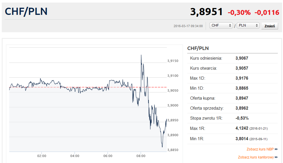 Jeszcze przed ogłoszeniem komunikatu, frank szwajcarski lekko osłabiał się względem euro, a kurs zmierzał w kierunku 1,10 CHF. Z kolei na fali wczorajszej decyzji Rezerwy Federalnej euro umacnia się względem dolara - na parze EUR/USD przekroczony został poziom 1,127. Na wartości zyskuje też złoty – za główne waluty płacimy mniej niż wczoraj, a na szczególną uwagę zasługuje dolar poniżej 3,80 zł oraz frank poniżej 3,89 zł (najniżej w tym roku).