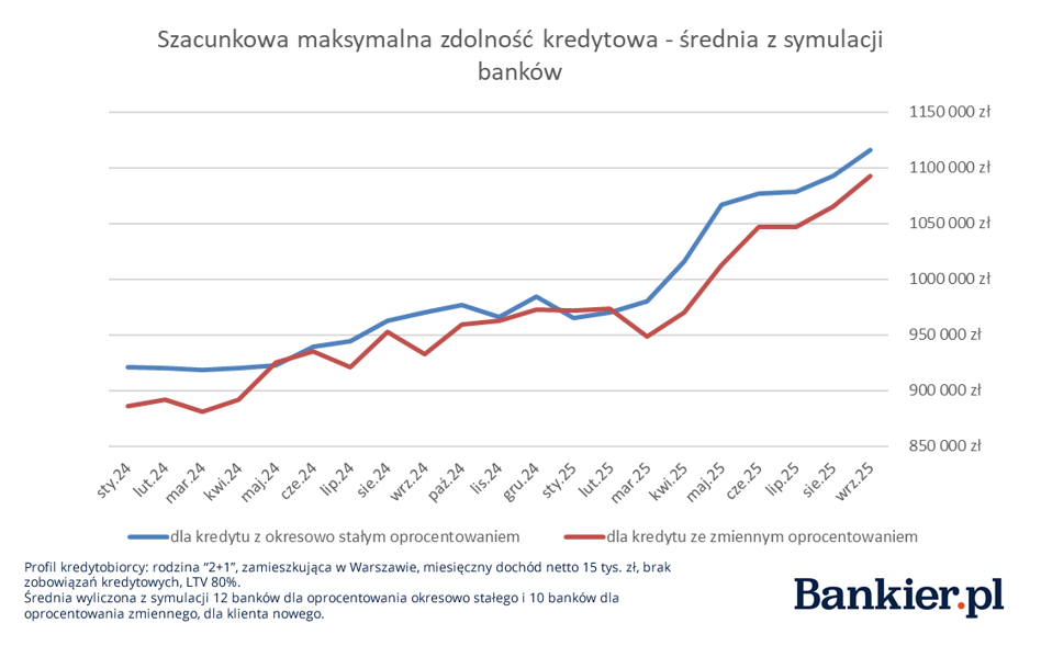 W szacunkach banków widzimy lekkie fluktuacje, kierunek nie jest w każdym miesiącu taki sam, nawet w czasach spadku stóp procentowych. W perspektywie kilku miesięcy i po uśrednieniu symulacji wszystkich graczy widać nieprzerwany marsz w górę. Na koniec III kw. na rynku był tylko jeden bank proponujący rodzinie z dochodem 15 tys. zł miesięcznie mniej niż 1 mln zł. W styczniu 2025 r. ta grupa liczyła 6 instytucji.