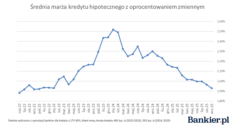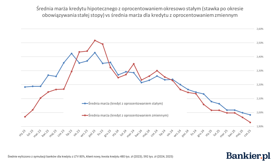 W porównaniu z czerwcem 2025 r. średnia marża spadła o blisko 0,07 pp. i znalazła się na poziomie 1,92 pp. Obserwując rynek w ostatnich miesiącach dostrzec można było objawy konkurencyjnych rozgrywek banków. Kredytodawcy, przynajmniej ci agresywniej celujący w zwiększenie udziału w rynku, zaczęli w końcu reagować na ruchy rywali. Korzystają kredytobiorcy, którzy nieco chętniej patrzą obecnie na zmiennoprocentowe warianty kredytów.