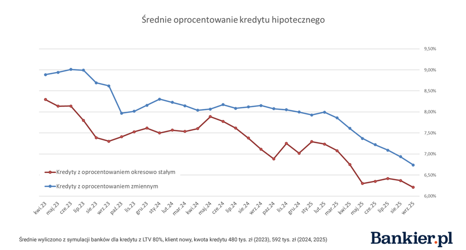 Oprocentowanie kredytów z okresowo stałą stopą obniżyło się w porównaniu z końcówką czerwca 2025 r. W czerwcu średnia z propozycji banków wynosiła 6,35 proc., a na koniec III kw. – 6,20 proc. Ruch tym razem nie był jednak tak zdecydowany jak w miesiącach wiosennych, gdy stawki zjechały o ok. 0,5 pp.