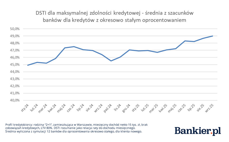 Średnia ze wskaźników DSTI lekko wzrosła w trzecim kwartale 2025 r. Zmiany miesiąc do miesiąca widoczne są zwykle na drugim miejscu po przecinku, ale po raz pierwszy widzimy w tym wskaźniku wartość 49 proc. To znak poluzowania podejścia kredytodawców, godzien dalszej obserwacji.