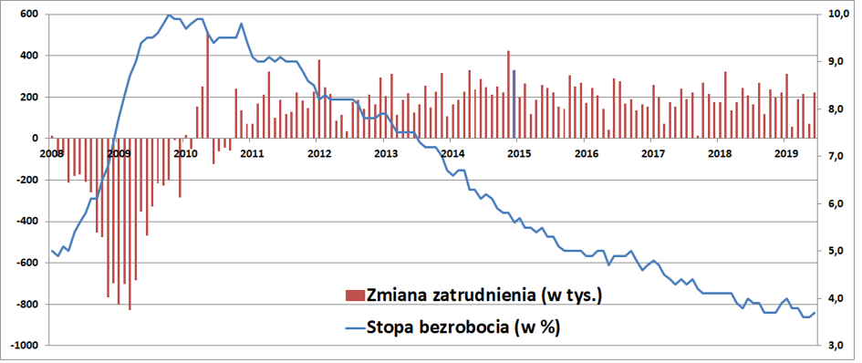 Stopa bezrobocia w USA wzrosła z najniższego poziomu od 50 lat, podnosząc się z 3,6% do 3,7%. Badanie ankietowe – przy pomocy którego BLS szacuje stopę bezrobocia – potwierdziło optymistyczne dane urzędowe. Badanie aktywności zawodowej pokazało wzrost liczby pracujących o 247 tys. przy wzroście liczby bezrobotnych o 87 tys. i spadku liczby biernych zawodowo o 158 tys. Zatem wzrost stopy bezrobocia nie był skutkiem masowych zwolnień, lecz wzrosty aktywności zawodowej Amerykanów.