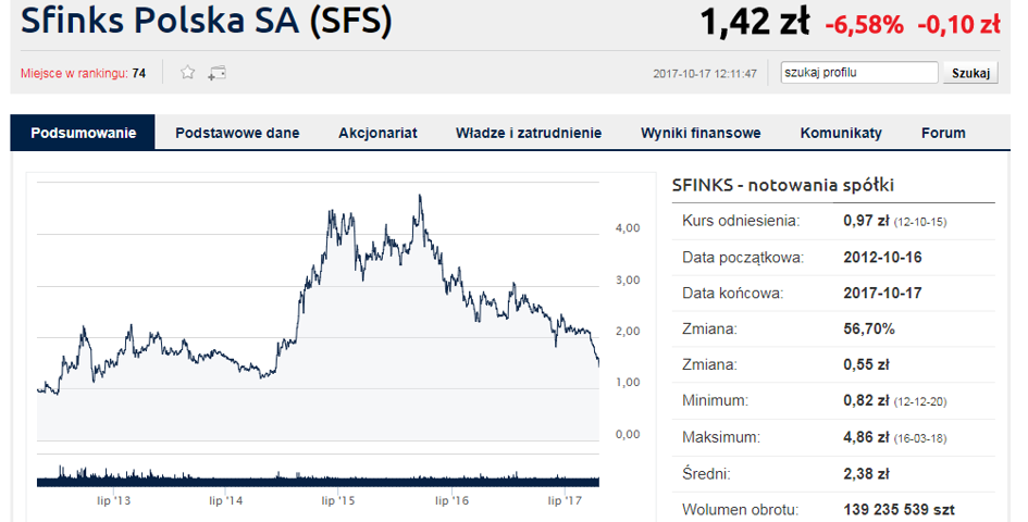 We wtorek przed południem za jedną akcję Sfinksa płacono na warszawskiej giełdzie 1,42 zł. Dla porównania ubiegły tydzień spółka kończyła na poziomie 1,6 zł. To jednak ledwie wycinek z szerszego trendu spadkowego. Jeszcze miesiąc temu za papiery Sfinksa płacono 2,1 zł, w marcu 2016 roku ich cena przekraczała zaś 4 zł. Giełdowa wartość spółki skurczyła się więc naprawdę poważnie.