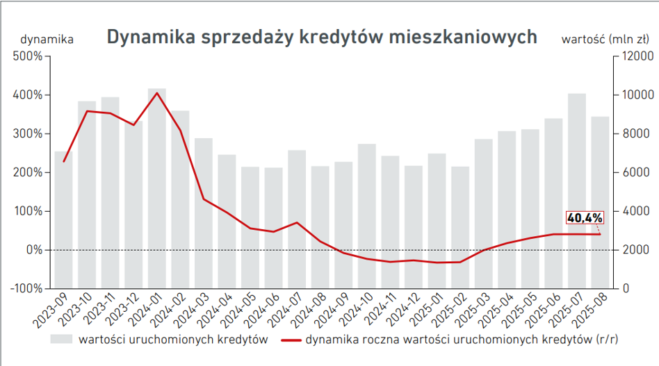 "Powodem wysokiej dodatniej dynamiki nowych kredytów mieszkaniowych w sierpniu tego roku jest czynnik statystyczny, gdyż sprzedaż z sierpnia odnosimy do sprzedaży z sierpnia 2024 r. Wówczas nie było już kredytów z puli programu wsparcia, a akcja kredytowa hamowana była wysokim oprocentowaniem kredytów mieszkaniowych" - dodano.