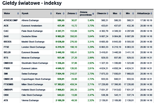 [Aktualizacja: 14:15] Chwilę po godzinie 14 niemiecki DAX zyskiwał 3,6%, francuski CAC40 rósł o 3,7%, a hiszpański IBEX35 o 3,3%. Żaden z głównych europejskich indeksów nie notował strat.