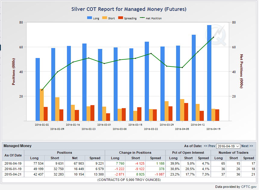 W poprzednim tygodniu na kontraktach terminowych podmioty zainteresowane zyskiem pochodzącym z zmiany notowań srebra otworzyły 7 760 kontraktów długich oraz 4 125 kontraktów krótkich. Według raportów COT ilość pozycji netto wynosi 67 903 kontraktów. Za kontynuacją wzrostów przemawia również słaby dolar amerykański oraz jego tendencja do dalszej deprecjacji.