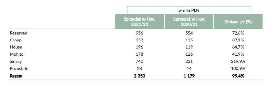 Dodatkowo na koniec roku obrotowego 2019 Reserved generował 41 proc. udziału w sprzedaży, podczas gdy Sinsay 12 proc. Na koniec roku obrotowego 2020 udział Sinsay wzrósł do 22,1 proc., Reserved odpowiadał jednak aż za 44,2 proc. Choć tutaj akurat warto zwrócić uwagę, że rok 2020 był specyficzny ze względu na pandemię i mocną sprzedaż poprzez ecommerce (w danych za 2019 ten obszar wydzielono w danych, w 2020 nie).