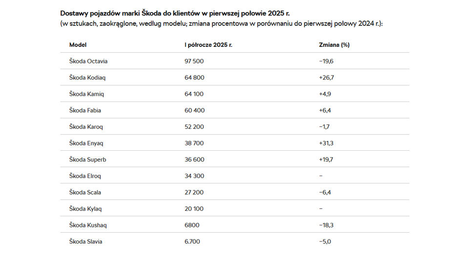 Warto jeszcze zwrócić uwagę na wzrost sprzedaży elektrycznych modeli Skody. Model Enyaq zanotował wzrost sprzedaży o 31,3% do 38,7 tys. sztuk, a model Elroq zadebiutował w sprzedaży od razu z wynikiem 34,3 tys. sztuk. Firma poinformowała również, że do końca czerwca klienci złożyli ponad 120 tys. zamówień na modele Enyaq i Elroq. Skoda zapowiedziała także na 2026 r. nowy model elektrycznego SUV-a Epiq w cenie 25 tys. euro.