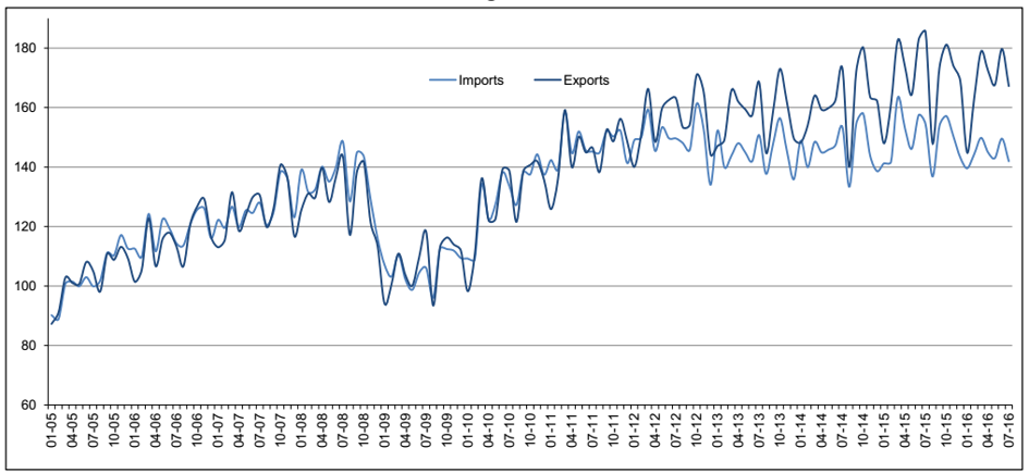 W lipcu wartość eksportu ze strefy euro wyniosła 167,2 mld euro i była o 10% mniejsza niż w lipcu 2015 r. – poinformował Eurostat. Import spadł o 8% rdr, do 154,4 mld euro. O 7% rdr zmalał też handel wewnątrz strefy euro. Nadwyżka handlowa euro landu wyniosła 25,3 mld euro i była o 19% mniejsza niż przed rokiem.