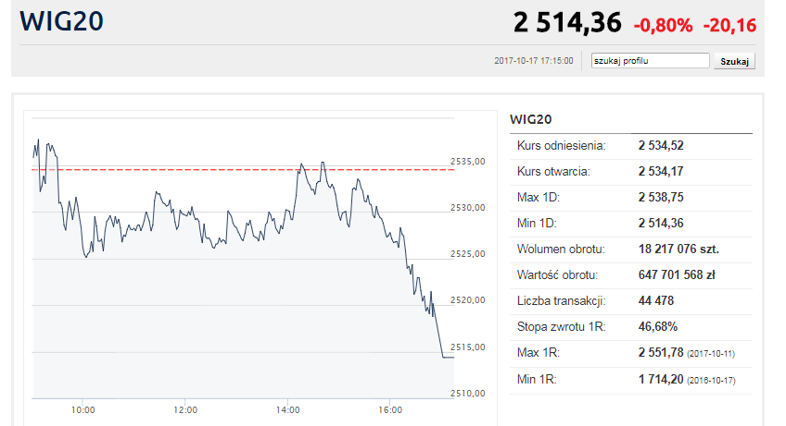 | WIG 20 | Polska | 2514,36 | -0,80 | -0,08 | 0,64 | 46,68 | 29,08 |