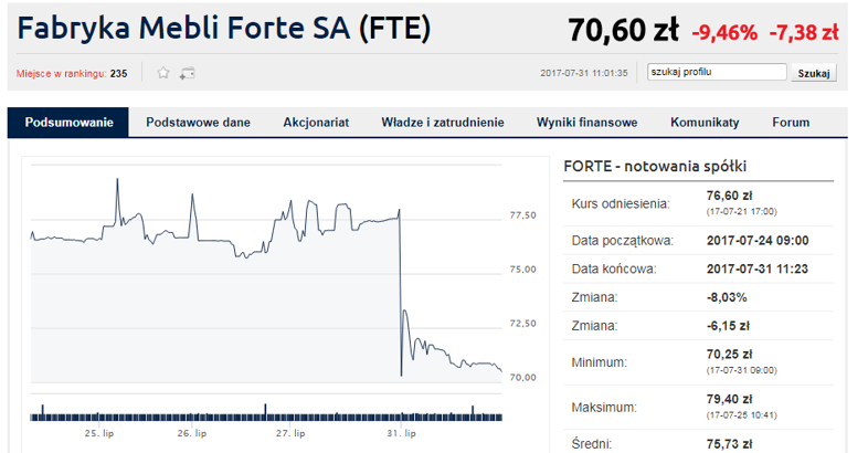 Znalazło to przełożenie na giełdowe notowania Forte. Te topnieją dziś o 9,5 proc. do 70,6 zł za akcję. Tak nisko papiery meblowej spółki spod znaku słonia nie były notowane od przełomu października i listopada 2016 roku, a więc od trzech kwartałów.