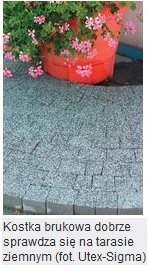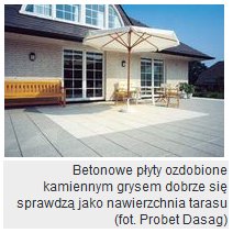 I wreszcie ostatni etap – wykonanie nawierzchni. Mogą nią być betonowa kostka lub płyty chodnikowe – zwane przez niektórych producentów tarasowymi. Ładnie wyglądają też płyty kamienne lub z imitacji kamienia. Elementy nawierzchni trzeba ułożyć ściśle, dobijając je gumowym młotkiem. Pozostałe szczeliny zasypuje się piaskiem i zamula wodą. Tak wykonany taras jest trwały, nie zaszkodzą mu jesienna słota ani mróz.