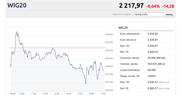 | WIG 20 | Polska | 2217,97 | -0,64 | -0,71 | 1,43 | -9,75 | -9,88 |