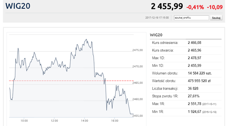 | WIG 20 | Polska | 2455,99 | -0,41 | 1,75 | 0,50 | 27,61 | 26,08 |