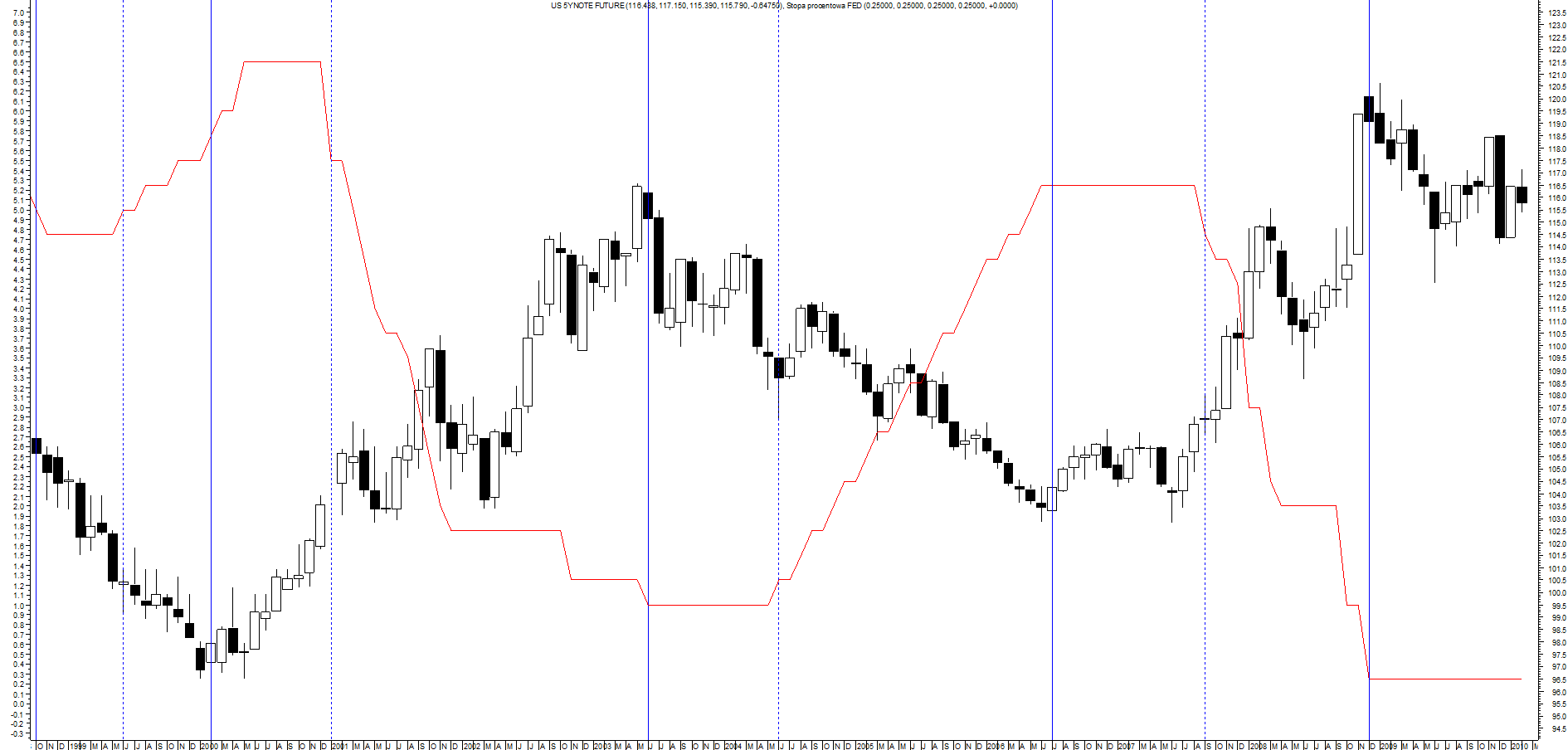 Rys.1. Wykres pięcioletnich obligacji rządu USA (czarno – białe świece) i stóp procentowych FED w ujęciu miesięcznym (czerwona linia).