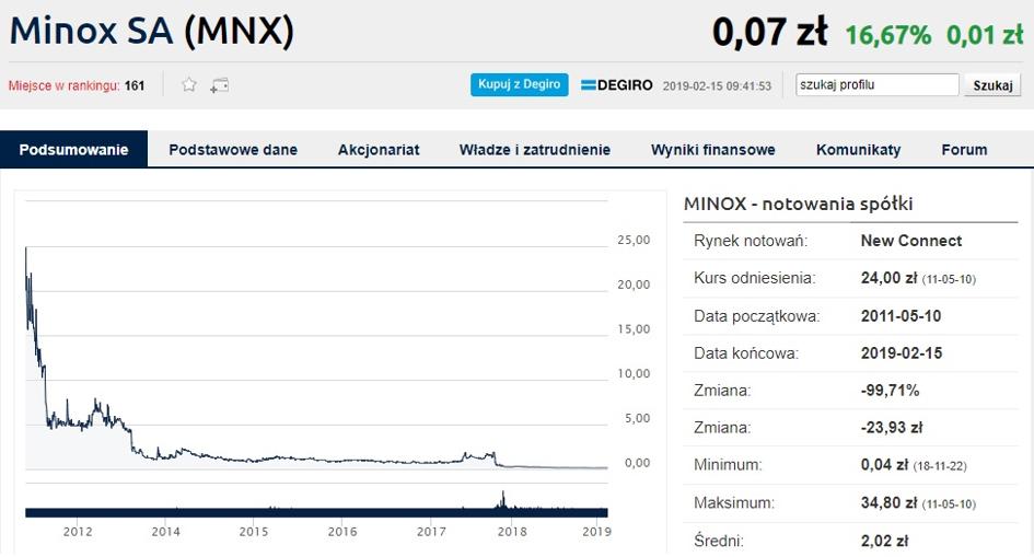 15 lutego 2019 roku w związku z nieprzekazywaniem raportów, GPW zawiesiła obrót akcjami siedmiu spółek z NewConnect. Jedną z nich była, obecna już niejednokrotnie na liście zawieszeń, spółka Minox, która tym razem nie przekazała na czas wyników za IV kwartał 2018 roku. Tydzień po zawieszeniu zarząd spółki postanowił wydać oświadczenie mające wytłumaczyć obecne problemy.