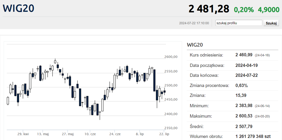 WIG20 zyskał 0,20%, docierając do 2481 pkt. WIG umocnił się o 0,28%. Indeksy MWIG40 i SWIG80 zyskały odpowiednio 0,69% i 0,10%. Obroty na głównym parkiecie warszawskiej giełdzie wyniosły ok. 866 mln zł, z czego 697 mln zł dotyczyło WIG20.