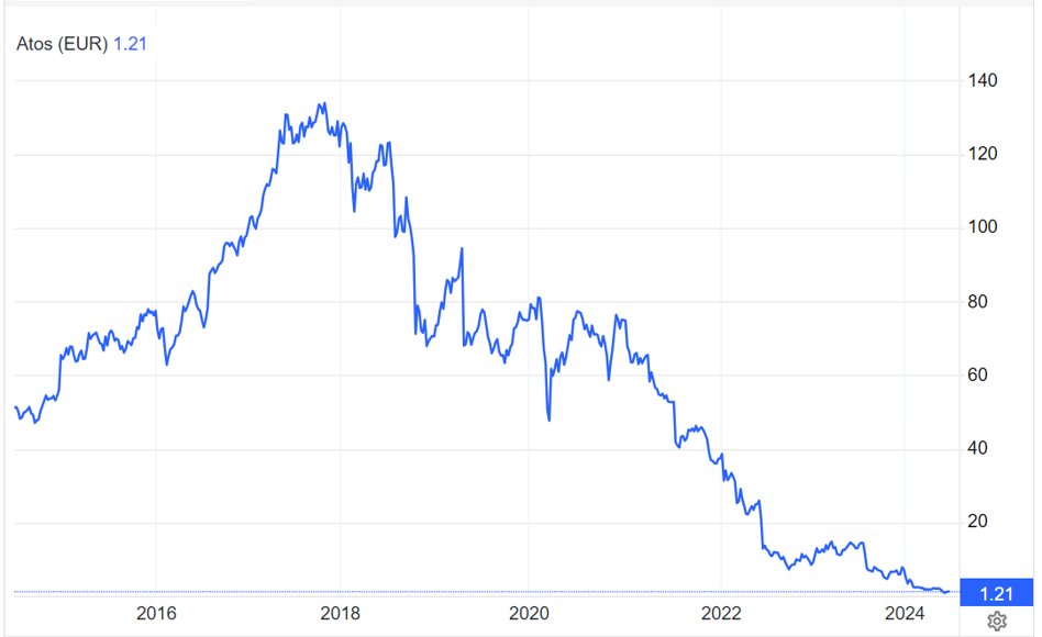 Atos poinformował w środę, że konsorcjum pod przewodnictwem Onepoint wycofało propozycję konwersji 2,9 miliarda euro długu na akcje. Była to oferta ratunkowa od największego akcjonariusza francuskiego giganta informatycznego wycenianego kilka lat temu na blisko 13 mld euro, dziś wartego na giełdzie około 119 mln euro. Od szczytu z 2017 r., akcje notowane kiedyś w kluczowym francuskim indeksie CAC40, przeceniono do czerwca 2024 r. o ponad 99 proc.