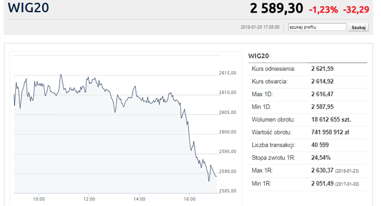 | WIG 20 | Polska | 2589,30 | -1,23 | -0,07 | 5,87 | 24,54 | 5,20 |