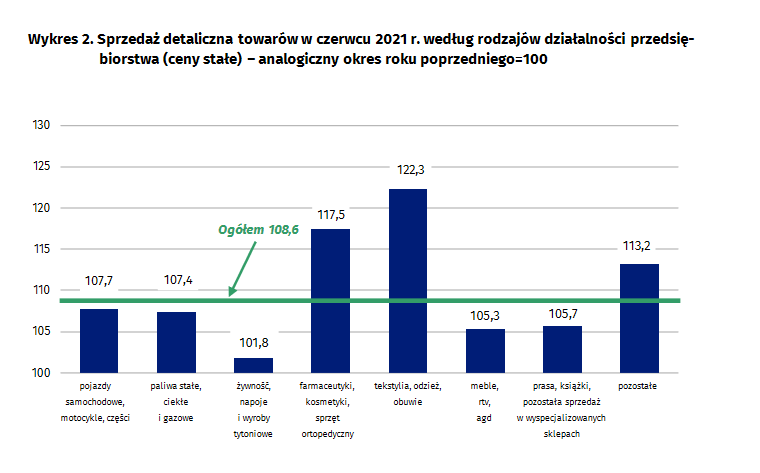 W czerwcu 2021 r. dynamika sprzedaży detalicznej ponownie była wysoka i przebiła oczekiwania ekonomistów. Nadal spada natomiast udział sprzedaży przez internet.