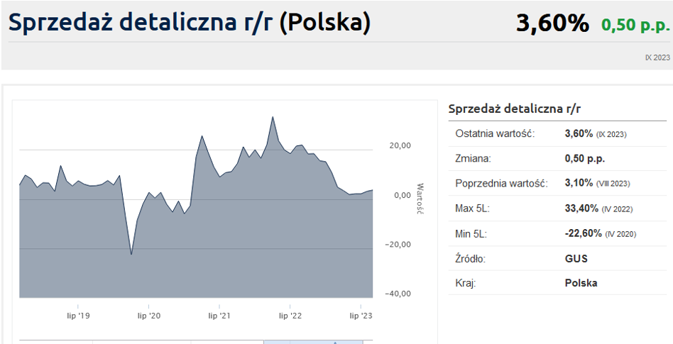 Wrześniowe wyniki sprzedaży detalicznej, choć wciąż były niższe niż rok temu, to równocześnie spadek był najsłabszy od stycznia. To potwierdzałoby tezę, że poprawa nastrojów konsumentów zaczyna przekładać się na decyzje zakupowe.