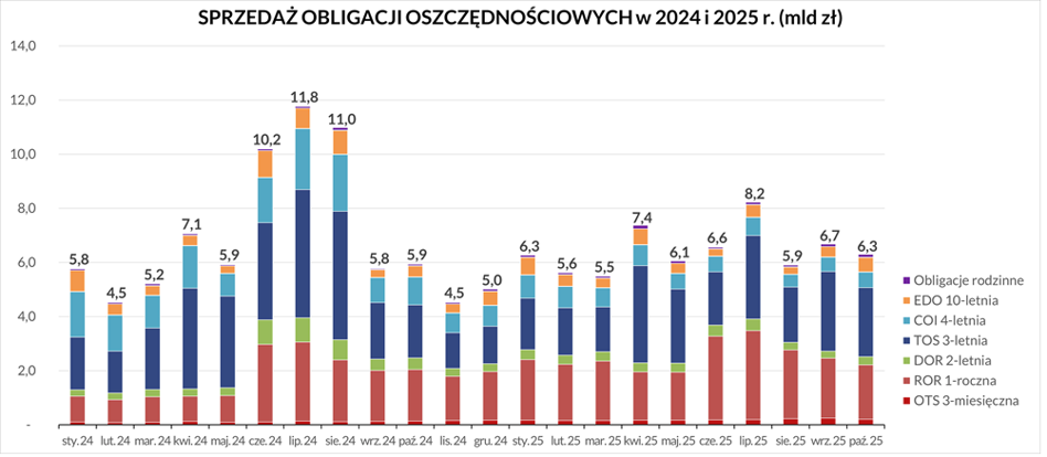 W październiku 2025 roku Ministerstwo Finansów sprzedało detaliczne obligacje skarbowe za blisko 6,3 mld złotych. To wynik o 5,7% niższy niż we wrześniu, lecz zarazem o 6,1% wyższy niż w październiku 2024 roku. To wciąż solidny wynik zważywszy na sukcesywnie malejące oprocentowanie tych papierów.