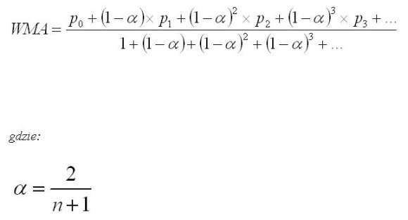 Średnia krocząca wyrównywana wykładniczo (eksponencjalna).Ta średnia również nadaje największą wagę ostatnim cenom. Jednak daje ona najlepsze wyniki, stąd jest najczęściej wykorzystywana. W oparciu o średnie wykładnicze jest zbudowany jeden z oscylatorów MACD.