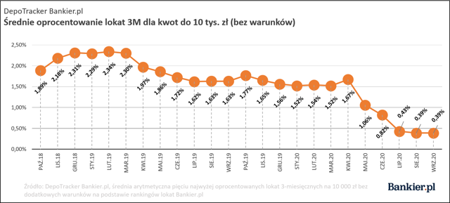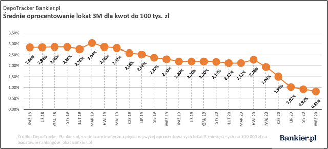 Lipiec 2020 r. był przełomowym miesiącem także dla lokat na ten okres. Zestawienie na ten miesiąc zaprezentowało czołówkę ze średnią niższą o 0,36 pp. od poprzedniej. Kolejne miesiące przedstawiły spadki o odpowiednio 0,09 pp. i 0,03 pp. Wśród banków, które zaprezentowały obniżki w tym okresie jest m.in. lider tabeli, tj. Lokata Facto od BFF Banking Group, a także BOŚ Bank, Credit Agricole, Nest Bank czy Toyota Bank.