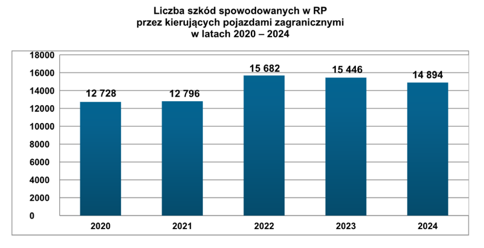 Według Polskiego Biura Ubezpieczycieli Komunikacyjnych kierowcy z zagranicy odpowiadali w 2024 r. za 14,9 tys. wypadków i kolizji na polskich drogach, co stanowi spadek o ok. 3,6% w stosunku do roku 2023 (dane dotyczą systemu Zielonej Karty). Średnia wartość szkody spowodowanej przez cudzoziemców zwiększyła się z 8045 zł do 9121 zł. Wyższa liczba zdarzeń z lat 2022–2023 w ocenie Biura związana jest z odbudową ruchu transgranicznego po pandemii.