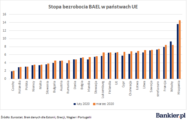 Mimo to na uwagę zasługuje fakt, że stopa bezrobocia w marcu wzrosła względem lutego w 19 państwach członkowskich – najmocniej w Hiszpanii (z 13,6 proc. do 14,5 proc.) i na Cyprze (z 5,8 proc. do 6,7 proc.). Pełnego obrazu jednak nie znamy, ponieważ marcowe dane nie napłynęły z Estonii, Grecji, Węgier i Portugalii.