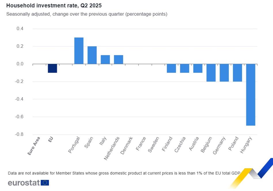 Oznacza to, że proporcjonalnie mniejsza część dochodu gospodarstw domowych została przeznaczona na inwestycje (np. w nieruchomości) niż w poprzednim kwartale. Jest to trend niepokojący w kontekście długoterminowego rozwoju. Wzrost inwestycji odnotowano m.in. w Portugalii (+0,3 pp) i Hiszpanii (+0,2 pp), natomiast największy spadek miał miejsce na Węgrzech (-0,7 pp).