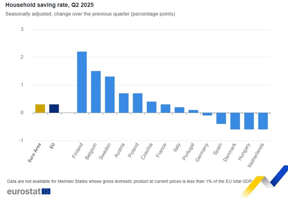 W drugim kwartale 2025 roku stopa oszczędności gospodarstw domowych w strefie euro i UE wzrosła o 0,3 punktu procentowego (pp). Polska odnotowała większy wzrost tego wskaźnika o +0,7 pp.