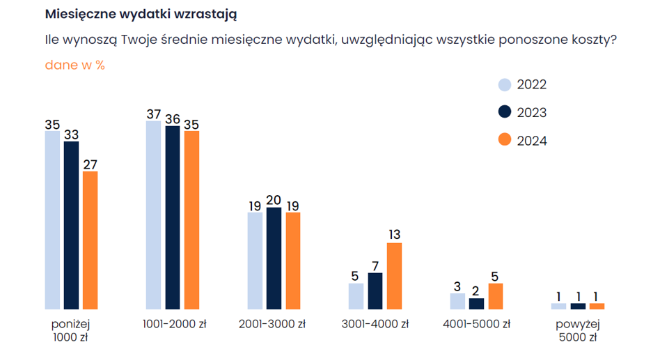 Większość studentów (35 proc.) wskazało, że ich miesięczne wydatki mieszczą się w przedziale od 1001 do 2000 zł. Jest to porównywalny odsetek z tymi w poprzednich latach. Natomiast zmniejsza się grupa żaków, którzy są w stanie zamknąć swoje miesięczne wydatki w kwocie poniżej 1000 zł. Odsetek badanych wskazujących tę odpowiedź zmalał o 6 pp. w porównaniu z 2023 r. Największy przyrost odnotowała grupa wydająca średnio od 3001 do 4000 zł miesięcznie. Wzrosty widoczne są także w przedziale 4001-5000 zł.