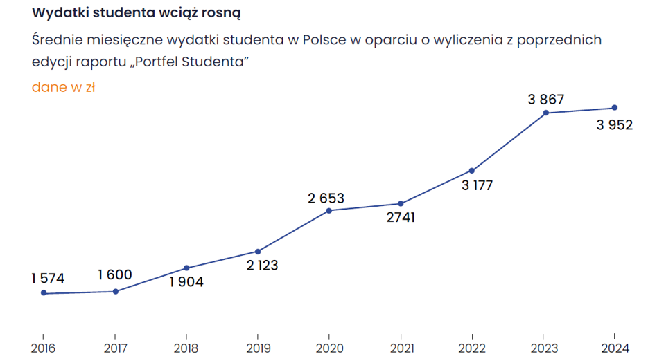 Jak wynika z corocznej symulacji przeprowadzonej przez WIB w ramach raportu "Portfel Studenta 2024" na przykładzie studenta ekonomii z Wrocławia, polski student wydaje miesięcznie na swoje utrzymanie 3951,56 zł. Wydatki te wprawdzie wzrosły w stosunku do roku poprzedniego, ale tempo wzrostu jest mniejsze niż w poprzednich latach.