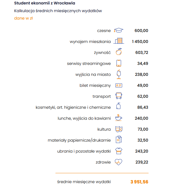 Tegoroczna symulacja dotyczy studenta trzeciego roku ekonomii z Wrocławia. Autorzy raportu przyjęli założenie, że kształci się on w trybie niestacjonarnym w związku z rozpoczęciem pracy zawodowej w wymiarze całego etatu. W wynajmowanym wspólnie z kolegą z roku dwupokojowym mieszkaniu, zajmuje samodzielny, nieprzechodni pokój. Standard nieruchomości ocenia jako średni, lecz jak podkreśla - kluczową kwestię w wyborze mieszkania stanowiła jego bardzo dobra lokalizacja, pozwalająca dotrzeć zarówno na uczelnię jak i do pracy w ciągu niespełna 30 minut. Student swoją sytuację finansową ocenia jako przeciętną. Z powodu utraty wsparcia w postaci stypendium naukowego oraz nieznacznego przekroczenia kryterium dochodowego w przypadku stypendium socjalnego musiał zmienić pracę dorywczą na pełnoetatową, a co za tym idzie formę kształcenia ze stacjonarnej na niestacjonarną.