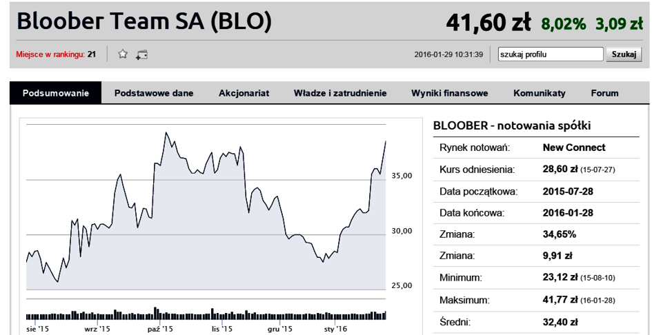 Bloober Team zaprezentował wczoraj wyniki kwartalne. Przy przychodach ze sprzedaży na poziomie 5,7 mln zł (wzrost o 316%), producent gier wypracował w IV kwartale 2015 r. 3,3 mln zł zysku netto (wzrost o 911%). W całym minionym roku sprzedaż krakowskiej spółki wyniosła 11,1 mln zł (wzrost o 94%), a zysk netto 3,7 mln zł. Zysk operacyjny wyniósł w opisywanym okresie aż 6,9 mln zł! To historycznie rekordowe wyniki spółki zarówno w ujęciu kwartalnym, jak i rocznym.