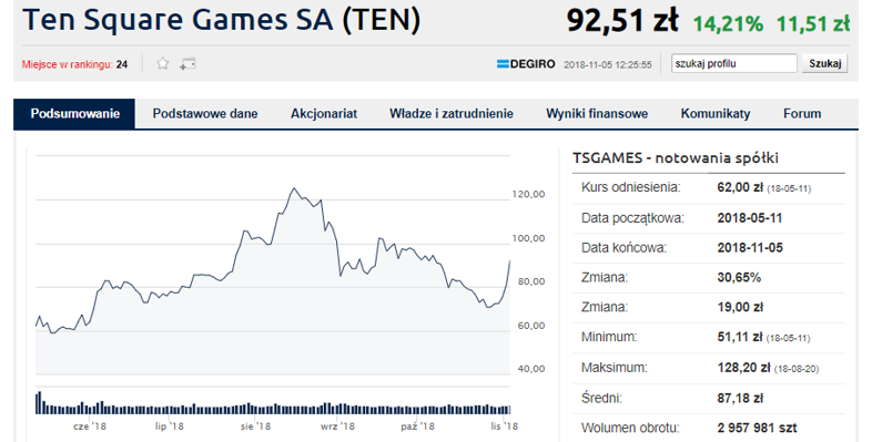 Tak mocny wzrost sprzedaży nie umknął inwestorom. Na poniedziałkowej sesji akcje Ten Square Games drożeją aż o 14,2 proc. Spółka ostatnimi wzrostami przerywa serię słabszych sesji, która między połową września, a końcówką października zbiła wycenę Ten Square o przeszło 30 proc.