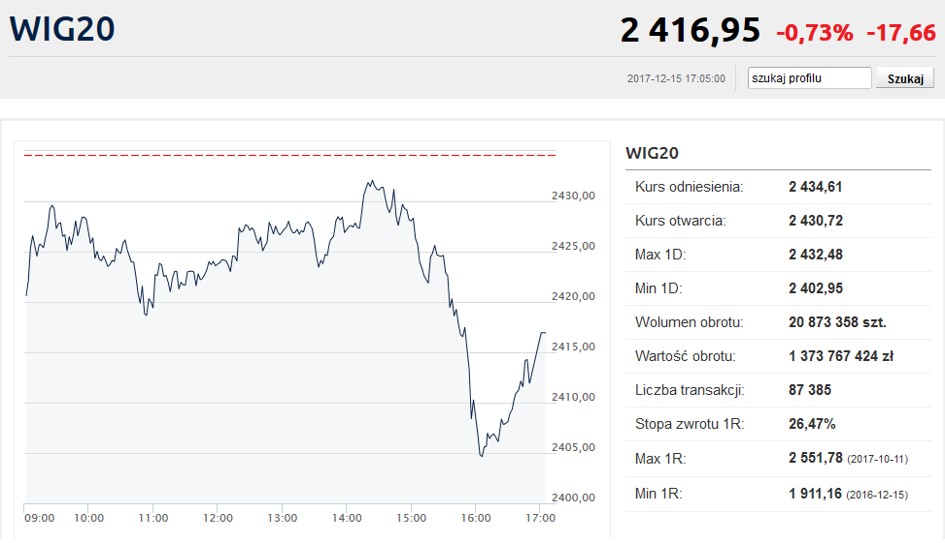 | WIG 20 | Polska | 2416,95 | -0,73 | 0,34 | -0,08 | 26,47 | 24,08 |