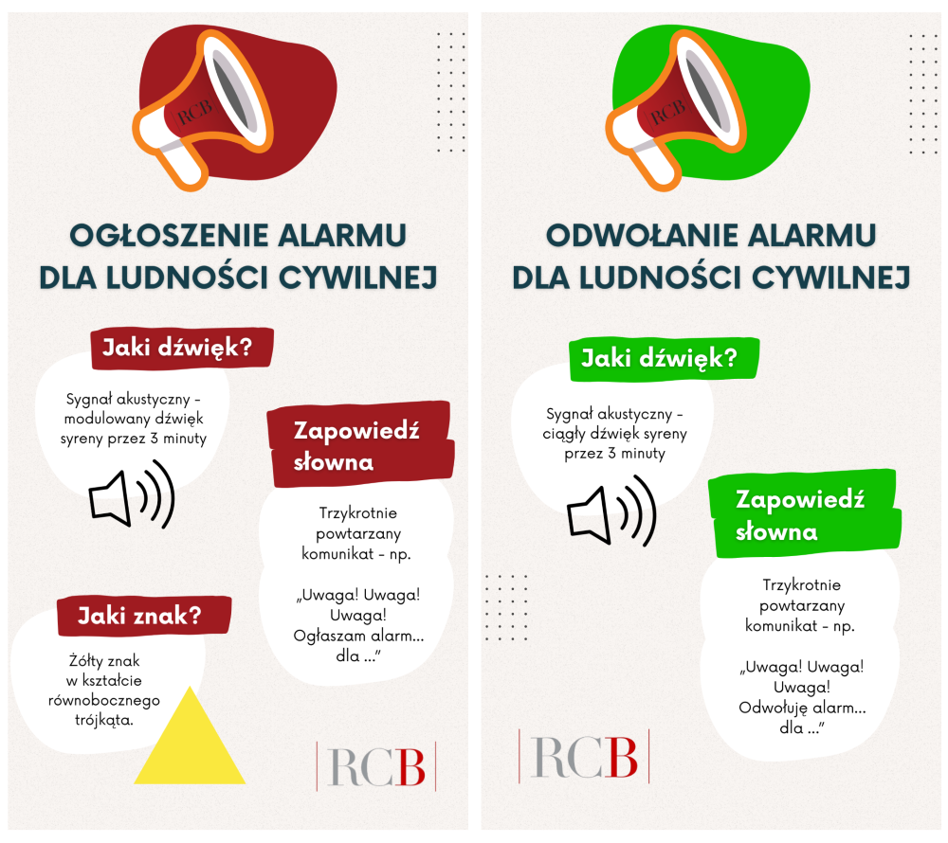 - Ogłoszenie alarmu – 3-minutowy, modulowany dźwięk syreny albo trzykrotnie powtarzany komunikat „Uwaga! Ogłaszam alarm…”;