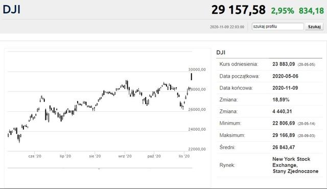Dlatego też przeważony typowo cyklicznymi, „klasycznymi” biznesami Dow Jones był w poniedziałek najmocniejszym z głównych nowojorskich indeksów. Ale nawet w przypadku DJIA w końcówce sesji dała o sobie znać podaż. Dow Jones, który jeszcze na pół godziny przed końcem handlu rósł o ponad 4,38%, ostatecznie ograniczył skalę zysków do 2,95%. Nie zmienia to faktu, ze w trakcie poniedziałkowej sesji średnia przemysłowa Dow Jonesa wybiła szczyt z lutego, osiągając rekordową wartość 29 933,83 punktów. Okrągły poziom 30 000 punktów był dziś na wyciągnięcie ręki, ale ostatecznie DJIA zakończył sesję blisko 850 punktów niżej.