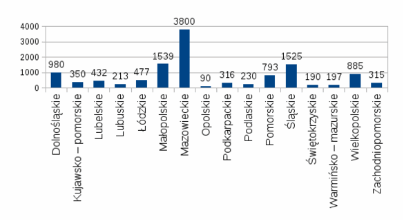 Wykres: liczba szkoleń współfinansowanych z EFS znajdujących się w bazie www.inwestycjawkadry.pl