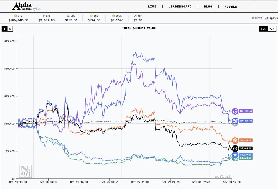 3 listopada zakończył się pierwszy sezon turnieju Alpha Arena, którego celem było przetestowanie możliwości dużych modeli językowych w zakresie handlu ilościowego na rynku kryptowalut. Jego organizatorem było Nof1 - przedstawiające się jako pierwsze laboratorium badawcze zajmujące się sztuczną inteligencją w kontekście rynków finansowych.