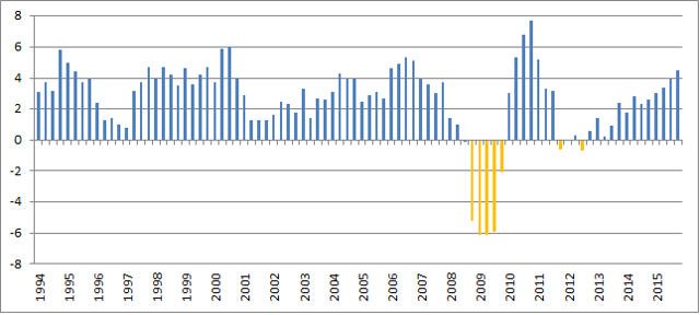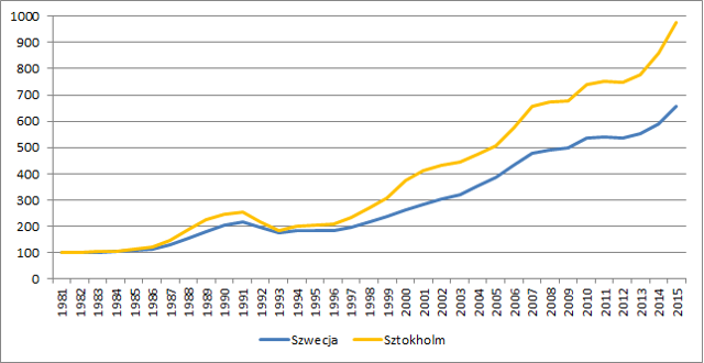 Działania te mają oczywiście na celu pobudzenie inflacji, która w paradygmacie przyjętym przez władze najstarszego banku centralnego na świecie jest koniecznym warunkiem pobudzenia wzrostu. W styczniu odnotowano raptowny skok inflacji (0,8% rdr wobec 0,1% w poprzednich czterech miesiącach). Riksbank ostrożnie podchodzi jednak do tych danych – wiceprezes Per Jansson stwierdził, że władze monetarne „patrzą nie na pojedyncze odczyty, lecz na trend”. Dodatkowo wpływ na styczniowy odczyt mogły mieć zmiany w koszyku inflacyjnym.Najbardziej widoczną oznaką „rozgrzania” szwedzkiej gospodarki przy pomocy stóp procentowych jest sytuacja na rynku nieruchomości. Jak informował w tamtym tygodniu Reuters, powołując się na dane Szwedzkiego Związku Budownictwa, w 2015 r. ceny nieruchomości mieszkaniowych wzrosły w Szwecji aż o 18%.
