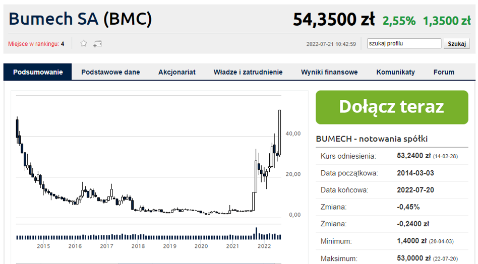 Jak wszystkie spółki z branży węglowej, Bumech ma za sobą bardzo dobry okres, na fali surowcowej hossy w związku z kryzysem energetycznym w Europie. Jego początek to jesień ubiegłego roku i jego pogłębienie wraz z atakiem Rosji na Ukrainę. Węglowe pomysły rządu, jak sprowadzanie surowca za wszelką cenę czy dotowanie gospodarstw domowych łączną kwotą ok. 11,5 mld zł tylko obnażyły jak wielki problem podażowy zaistniał w Polsce. Dzięki temu tylko w pięć ostatnich sesji akcje Bumechu podrożały o prawie 40 proc.