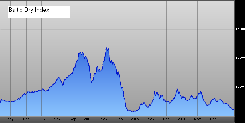 Idąca stromo w górę biała linia oznacza wzrost tonażu dostępnej floty transportowej, a malejąca pomarańczowa kreska obrazuje stopień jej wykorzystania. Ten prosty wykres pokazuje nam, że od początku 2009 roku pojemność transportowa zwiększyła się o 27,2%. W efekcie wykorzystanie mocy przerobowych armatorów nadal maleje, co przyczynia się do obniżki cen frachtu. Stąd właśnie otrzymujemy spadek BDI, czego jednak nie wolno utożsamiać z załamaniem koniunktury gospodarczej.