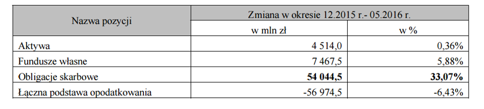 Od początku roku do końca maja zaangażowanie banków w obligacje skarbowe wzrosło o 54 mld zł, czyli o 33,07%. Był to główny element, który wpłynął na obniżenie w tym okresie podstawy opodatkowania o 57 mld zł. Gdyby banki zapłaciły podatek w grudniu 2015 roku, to z jego tytułu do kasy państwa wpłynęłoby ponad 20 mln zł więcej, niż z podatku za maj 2016 roku. W skali roku suma ta rośnie do ćwierć miliarda złotych.